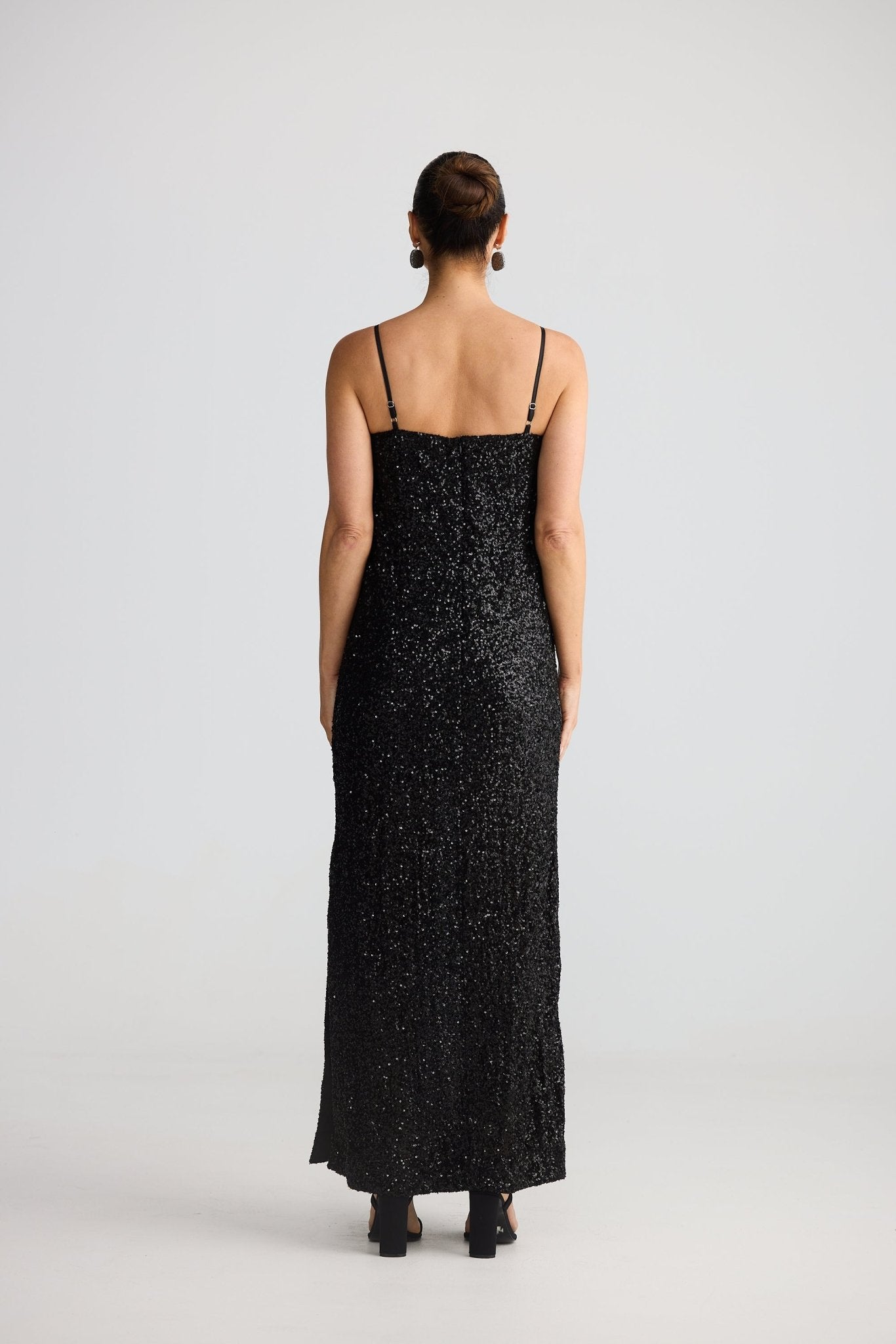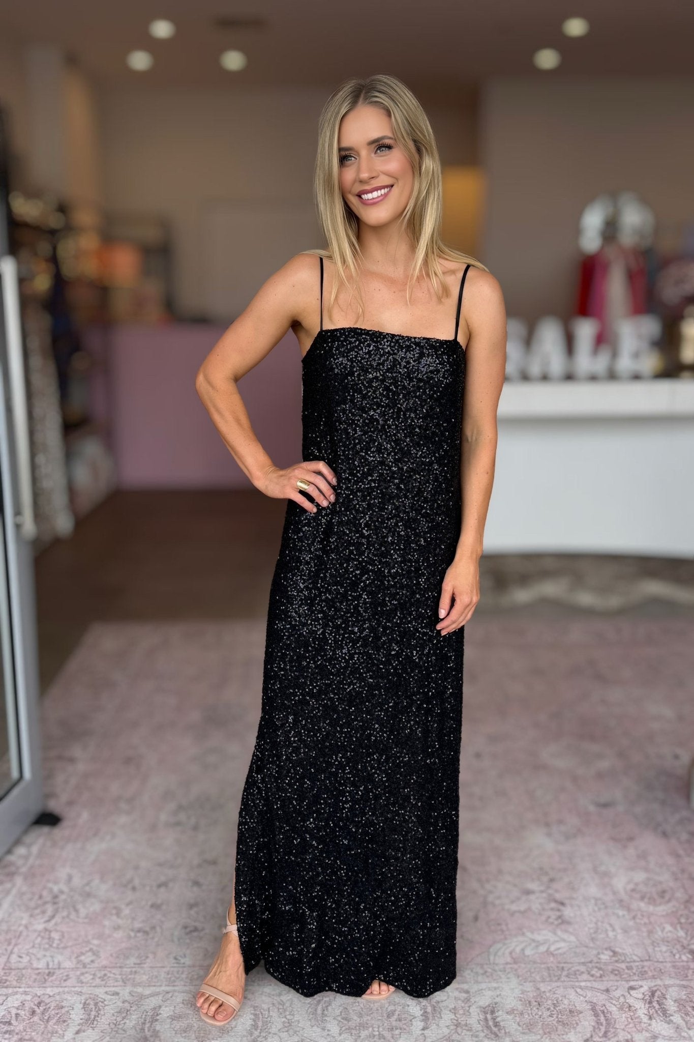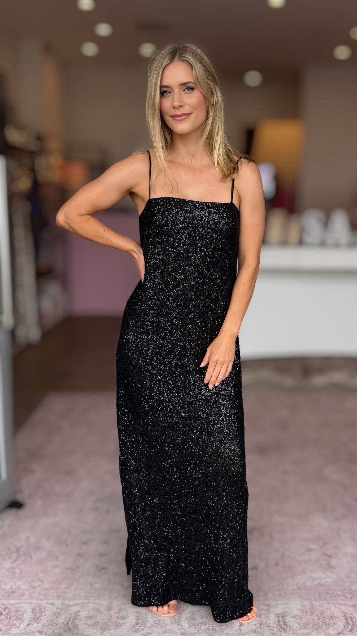 Shine from every angle in the Jazzy Maxi Dress, a statement piece made for modern glamour. Designed with a minimalist straight neckline and delicate adjustable straps, this full-length silhouette glides effortlessly over the body — balancing sleek sophistication with all-out sparkle.