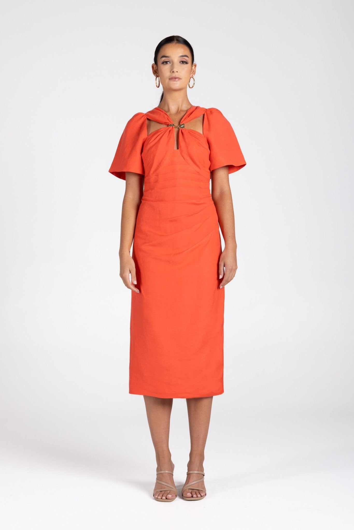Crafted from a breathable linen-viscose blend, it drapes beautifully over the body with gentle ruching through the torso that defines and flatters every curve. The sculptural neckline features a bra-friendly cut-out finished with a statement gold clasp, while softly structured sleeves balance the silhouette.