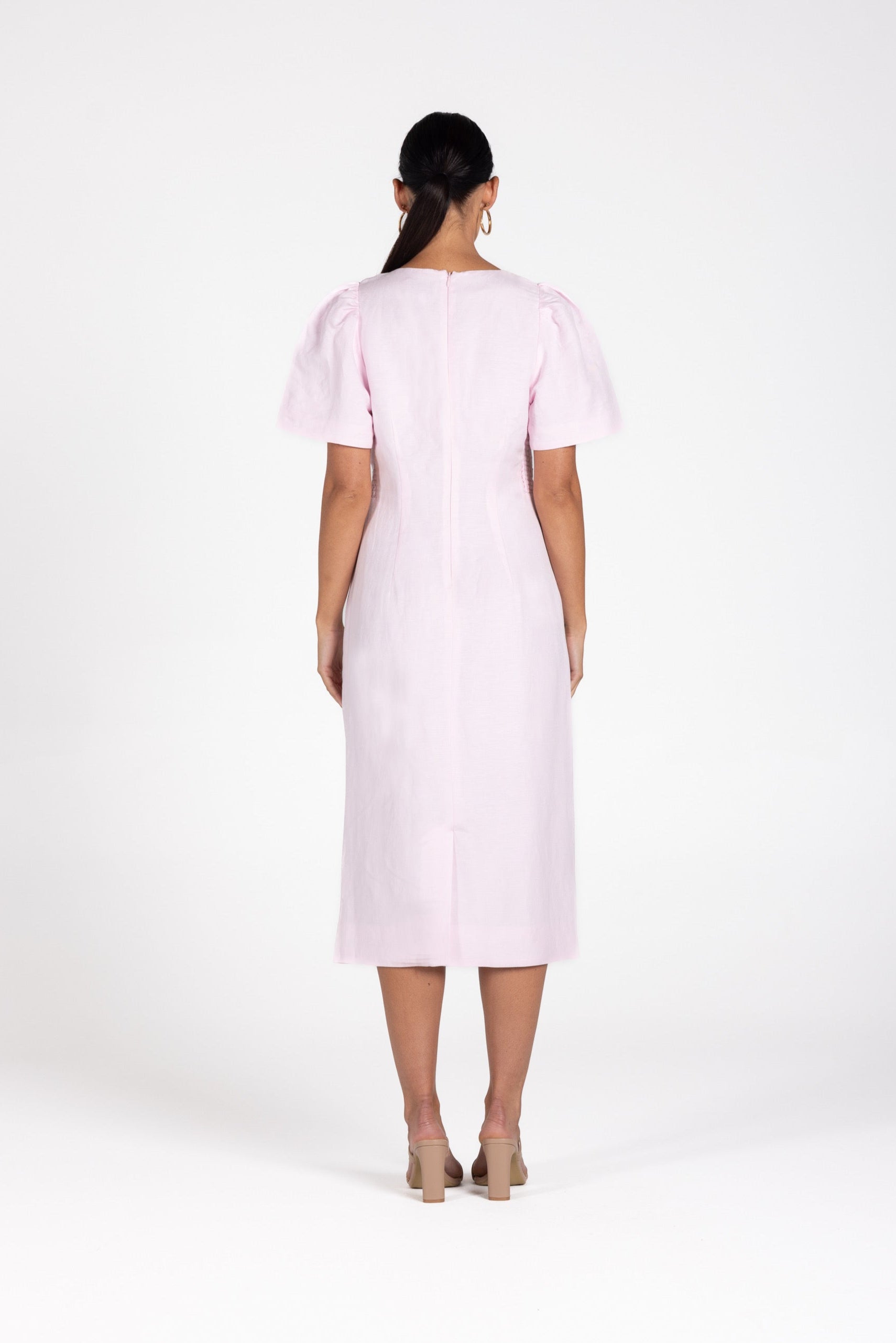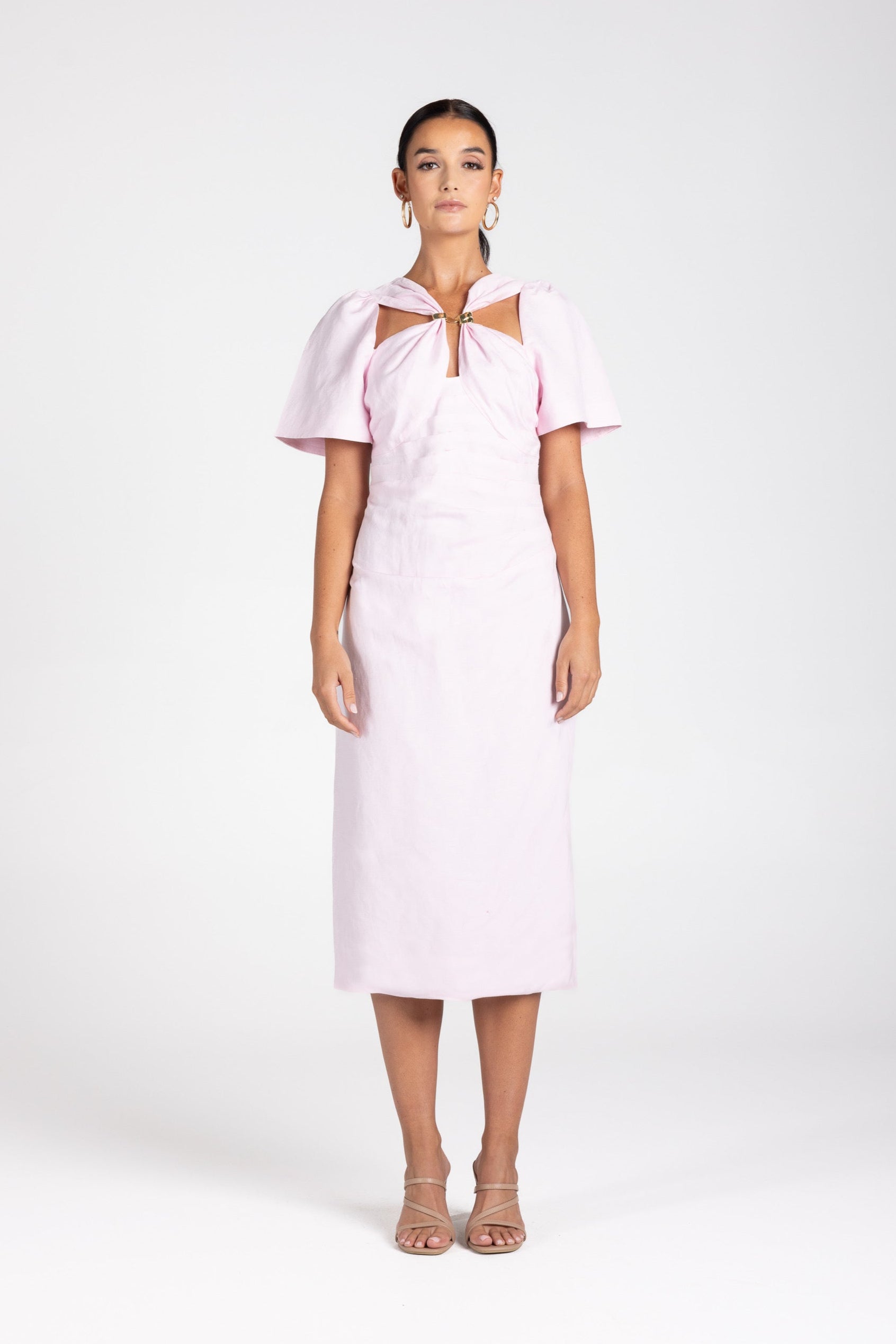 Crafted from a breathable linen-viscose blend, it drapes beautifully over the body with gentle ruching through the torso that defines and flatters every curve. The sculptural neckline features a bra-friendly cut-out finished with a statement gold clasp, while softly structured sleeves balance the silhouette.