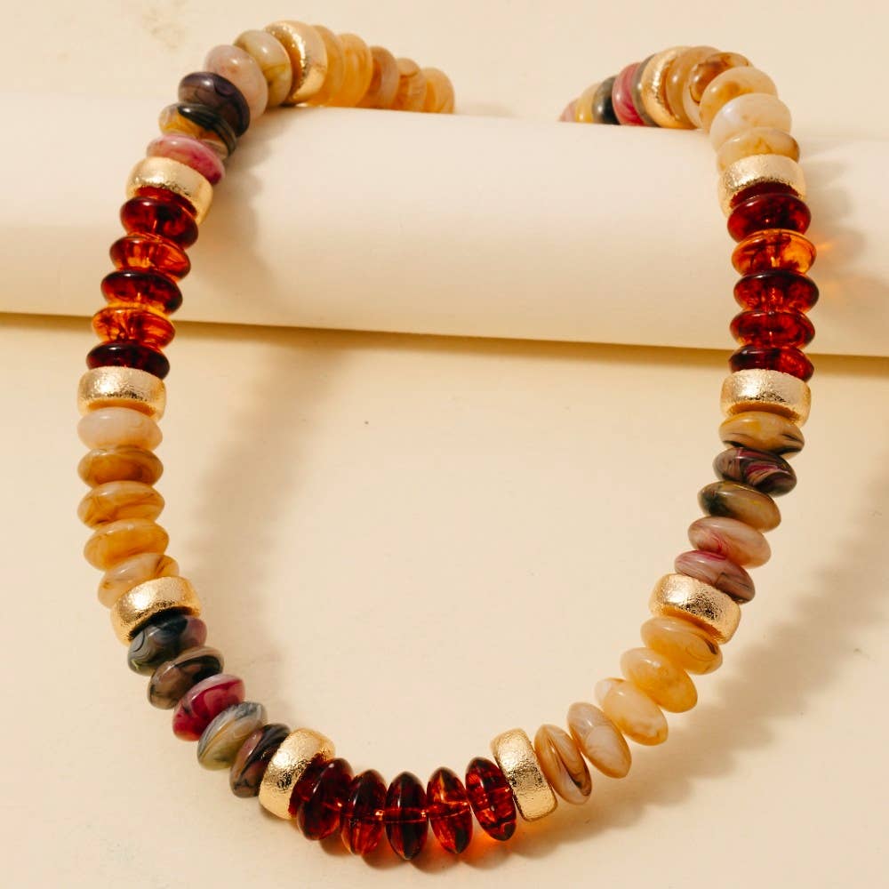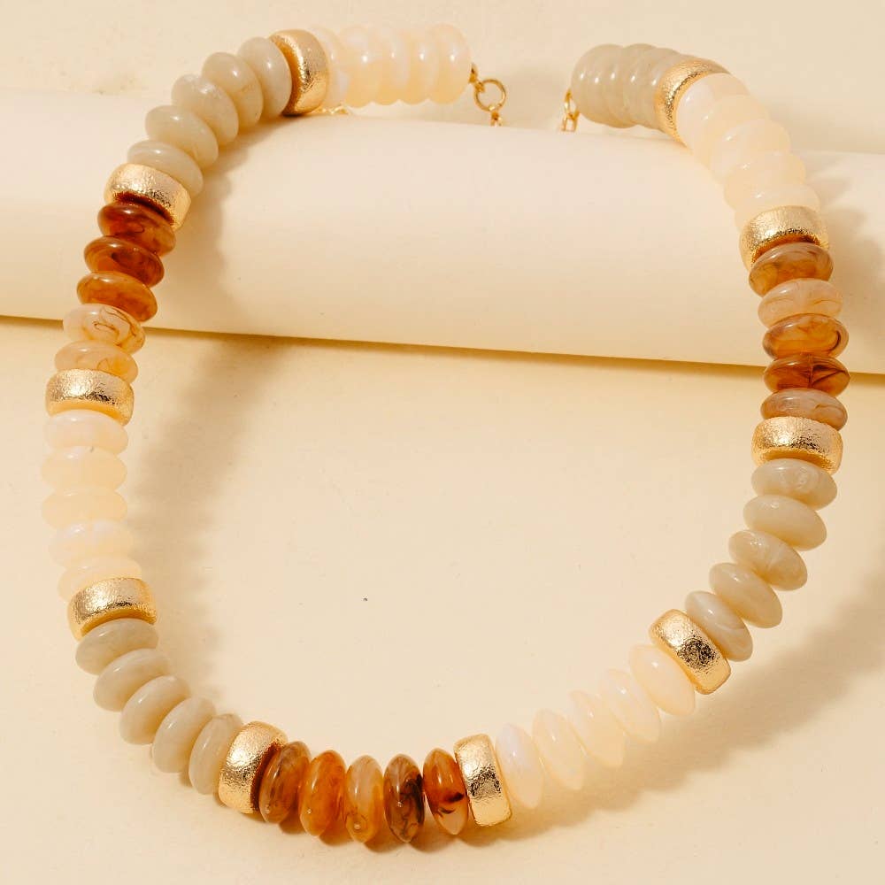 Bold yet beautifully balanced, this statement necklace features smooth, wide marble-look resin discs interspersed with soft metallic accents for a refined touch of shine. The organic mix of colour and texture gives the piece a sculptural, modern feel while remaining easy to wear and endlessly versatile.