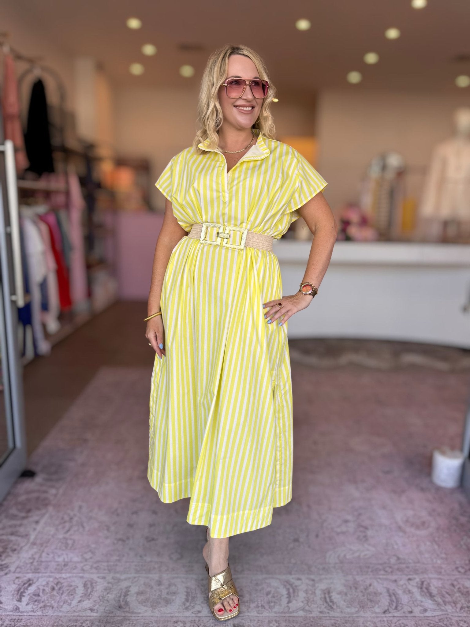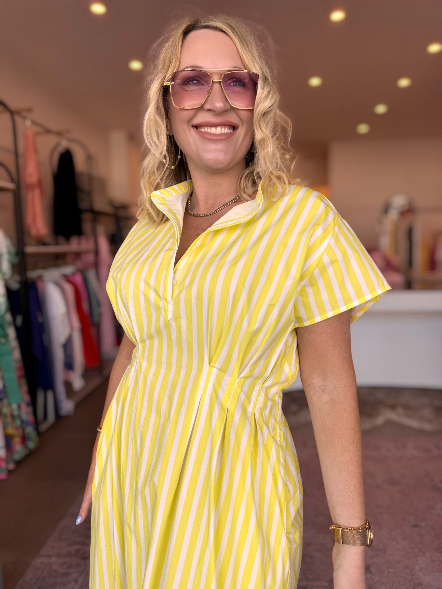 A sunny reinvention of a modern classic, the Mika Dress arrives in a custom yellow and white stripe designed exclusively for THE PINK. Defined by its soft structure and fluid lines, it features a sculptural silhouette shaped by subtle pleats that radiate from the waist, creating beautiful movement and flattering form.