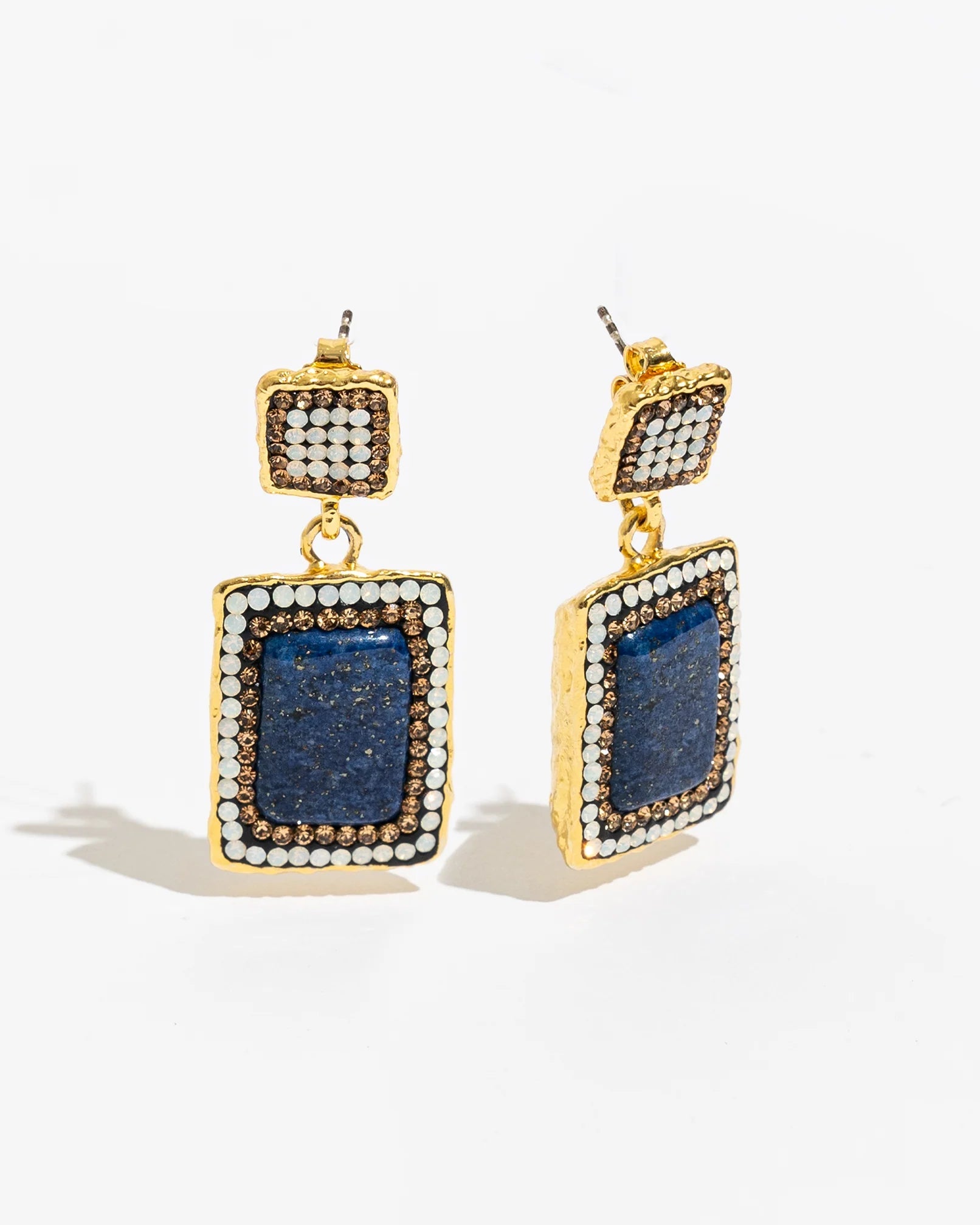 The handcrafted Aria Earrings feature a striking natural lapis lazuli gemstone accented by sparkling white opal and bronze crystals.