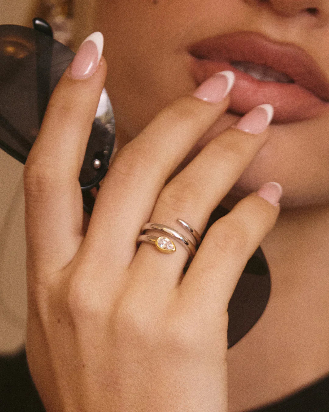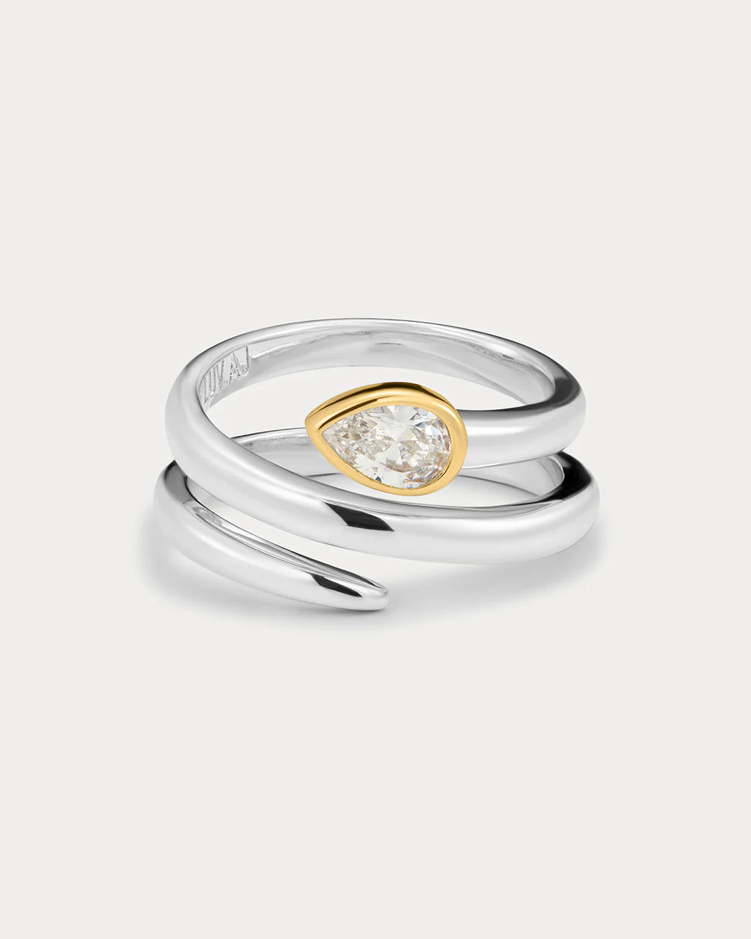 - Statement coiled ring featuring a pear-shaped stone