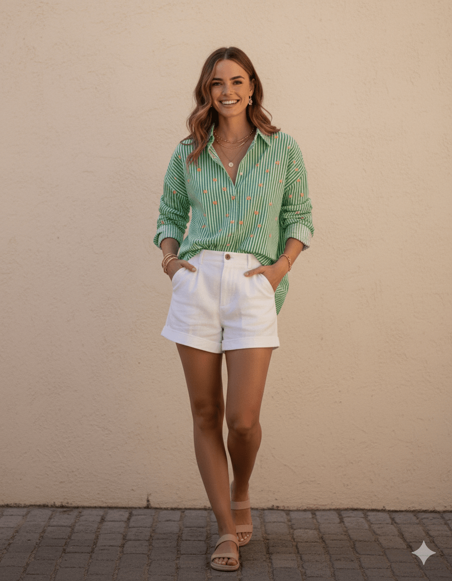Bring a fresh pop of summer into your wardrobe with the Zesty Boyfriend Shirt — a crisp cotton button-up sprinkled with playful lemon embroidery and finished with feminine cuff ties. Easy, breezy, and effortlessly cool.