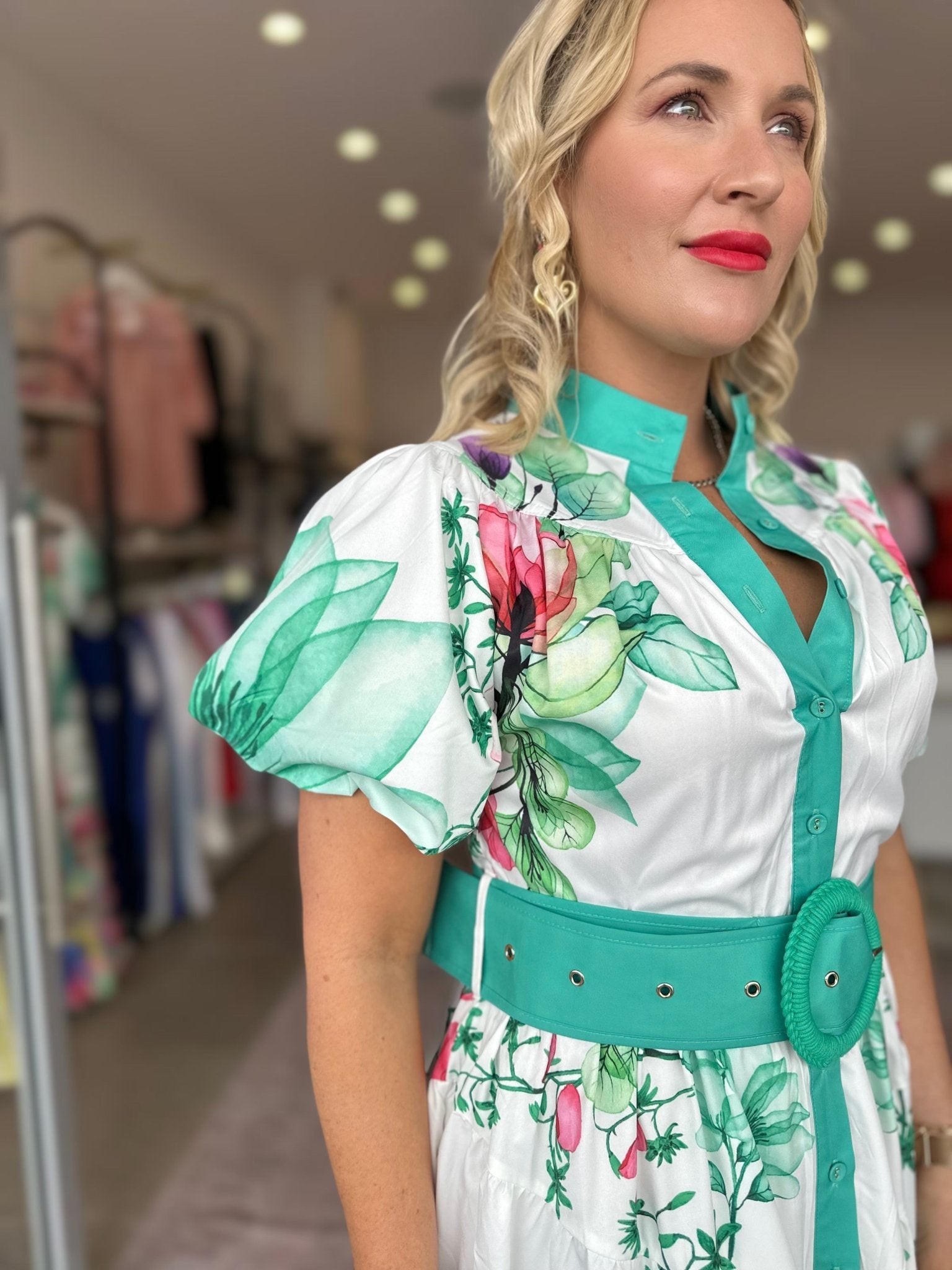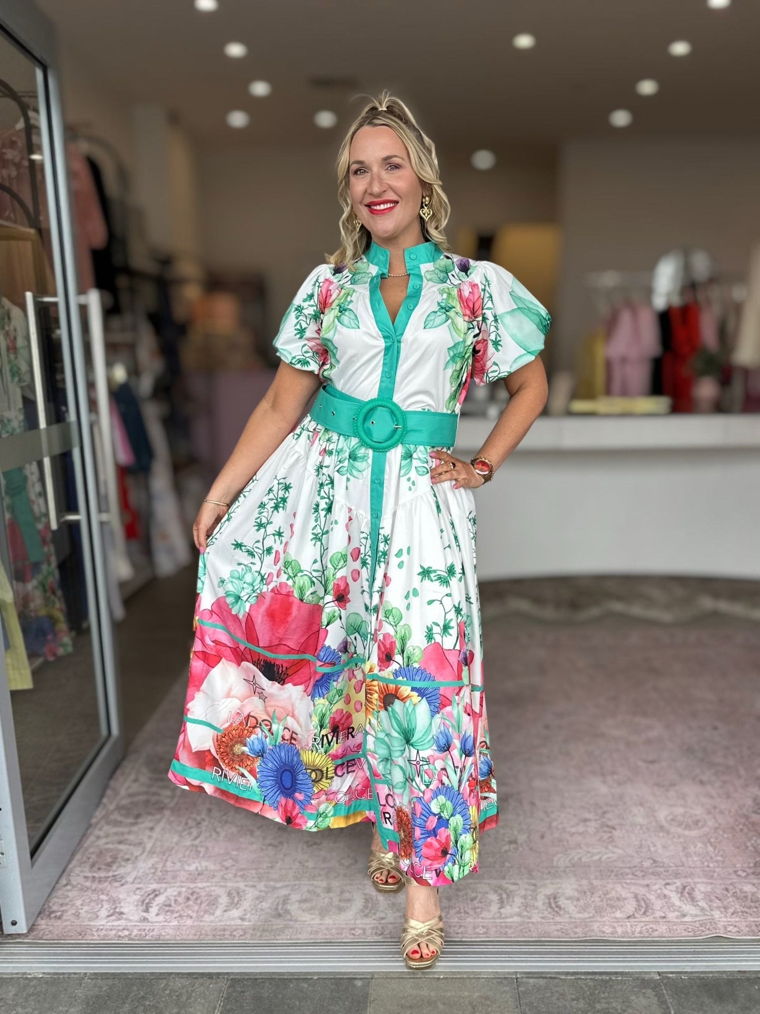Celebrate the season of sunshine in the Paloma Maxi Dress — a showstopping statement for spring soirées, long lunches, and summer parties. Crafted from a breathable cotton blend, it balances comfort and polish with its bold floral print, puff sleeves, and structured collar that channels Riviera glamour. The waist-cinching belt adds definition to the feminine silhouette, while the playful “Dolce Vita” script captures the carefree spirit of endless summer days.