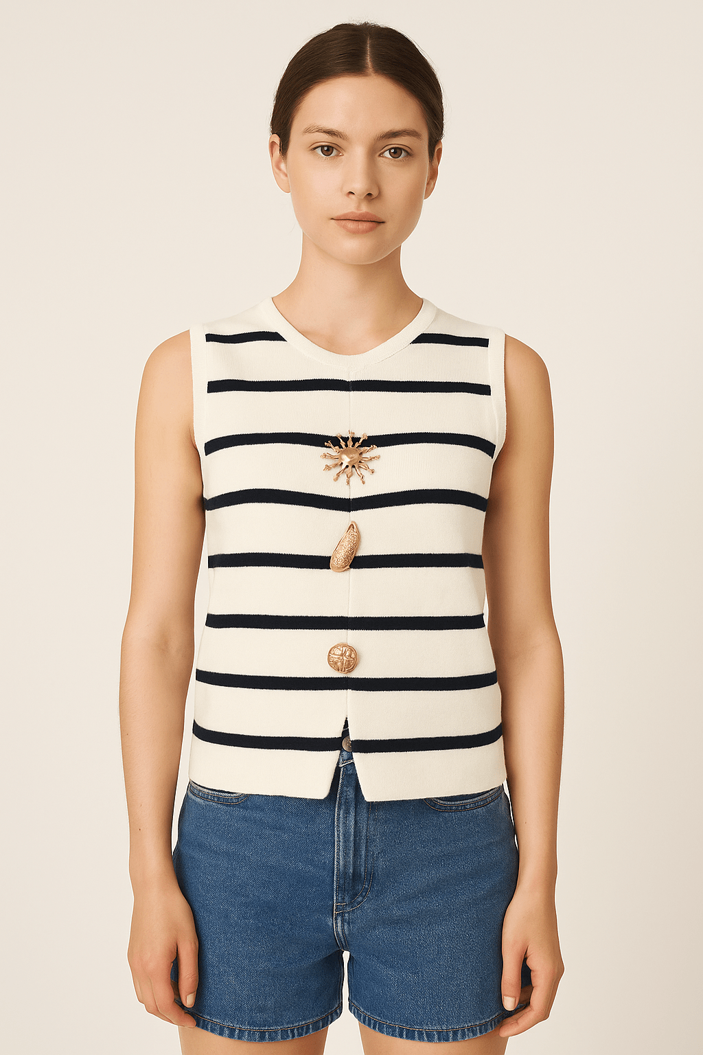 Meet your new coastal essential – the Isla Knit Tank. Crafted in a soft stretch knit with a flattering sleeveless cut, this piece is elevated by its statement gold buttons – a radiant sun, a delicate shell, and a classic medallion – evoking endless summer days by the sea.