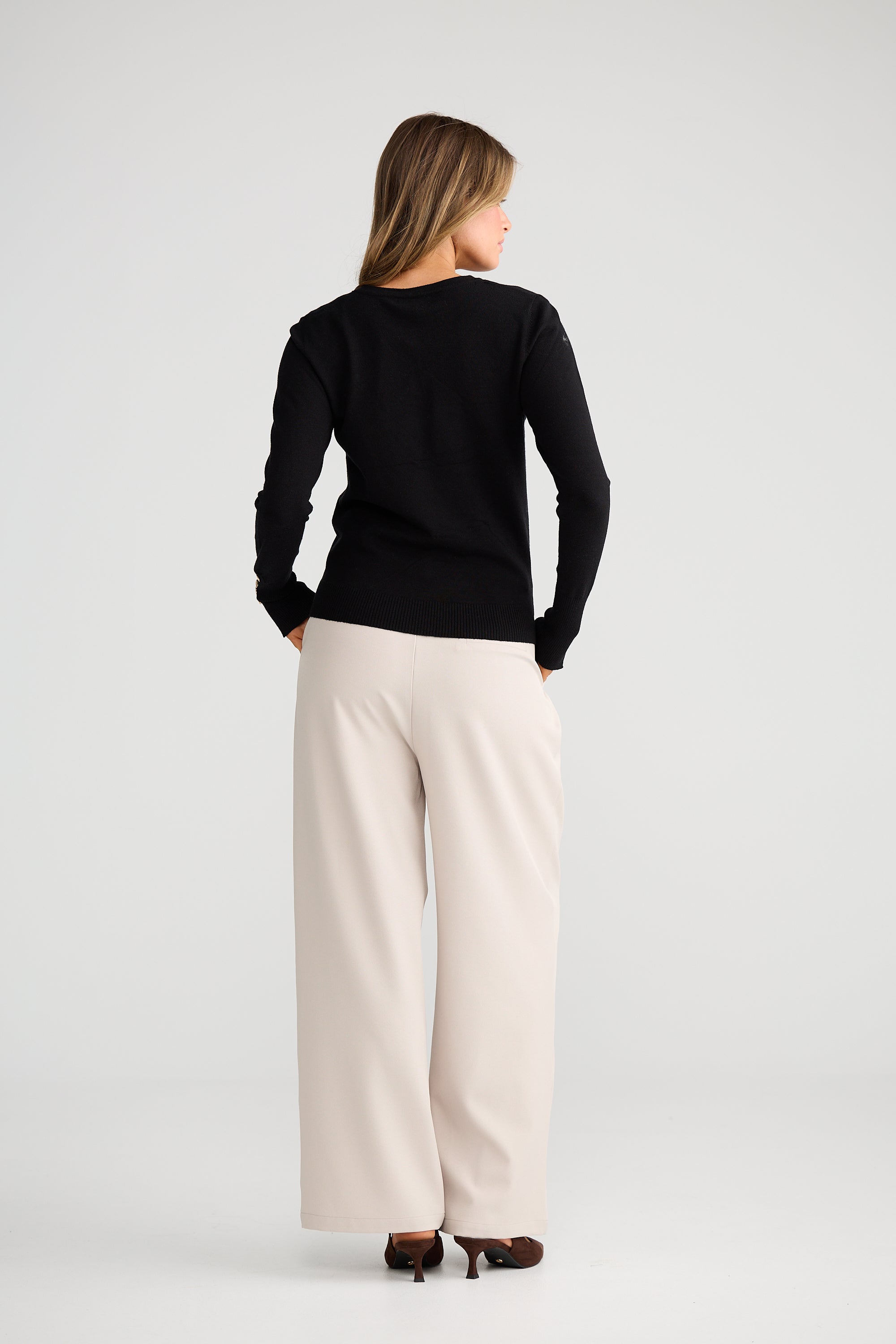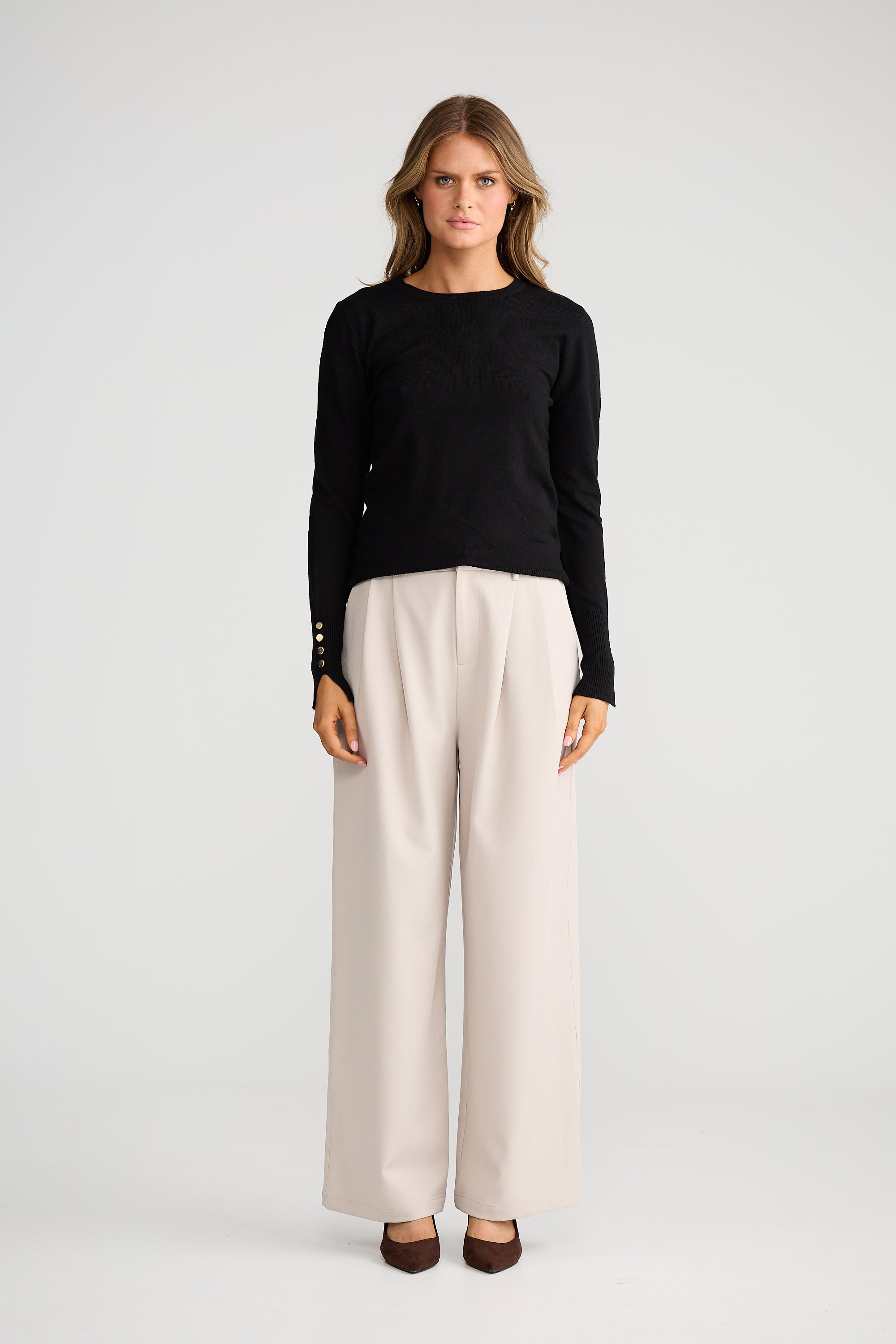 The St James Knit is your elevated everyday essential — crafted in a beautifully fine, ultra-soft knit with a flattering fitted silhouette. Finished with subtle gold button detailing at the cuffs and ribbed trims for a refined touch.