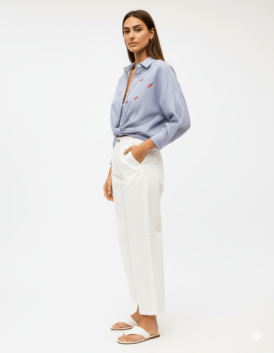 Turn up the heat in the Carolina Shirt, a playful twist on a timeless classic. Crafted from 100% cotton in a fresh blue-and-white stripe, this shirt features vibrant embroidered chillis scattered all over for a touch of cheeky charm. The design is elevated with red thread detailing on the buttons and cuff ties, adding just the right amount of personality.