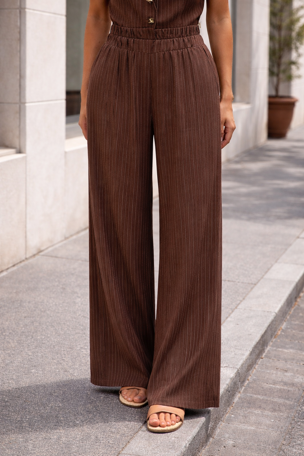 The Sienna Pants in Chocolate are the ultimate relaxed wide-leg trouser — cut from the same breathable linen-viscose blend as the Sienna Vest and finished in a fine chocolate pinstripe that elongates and refines.