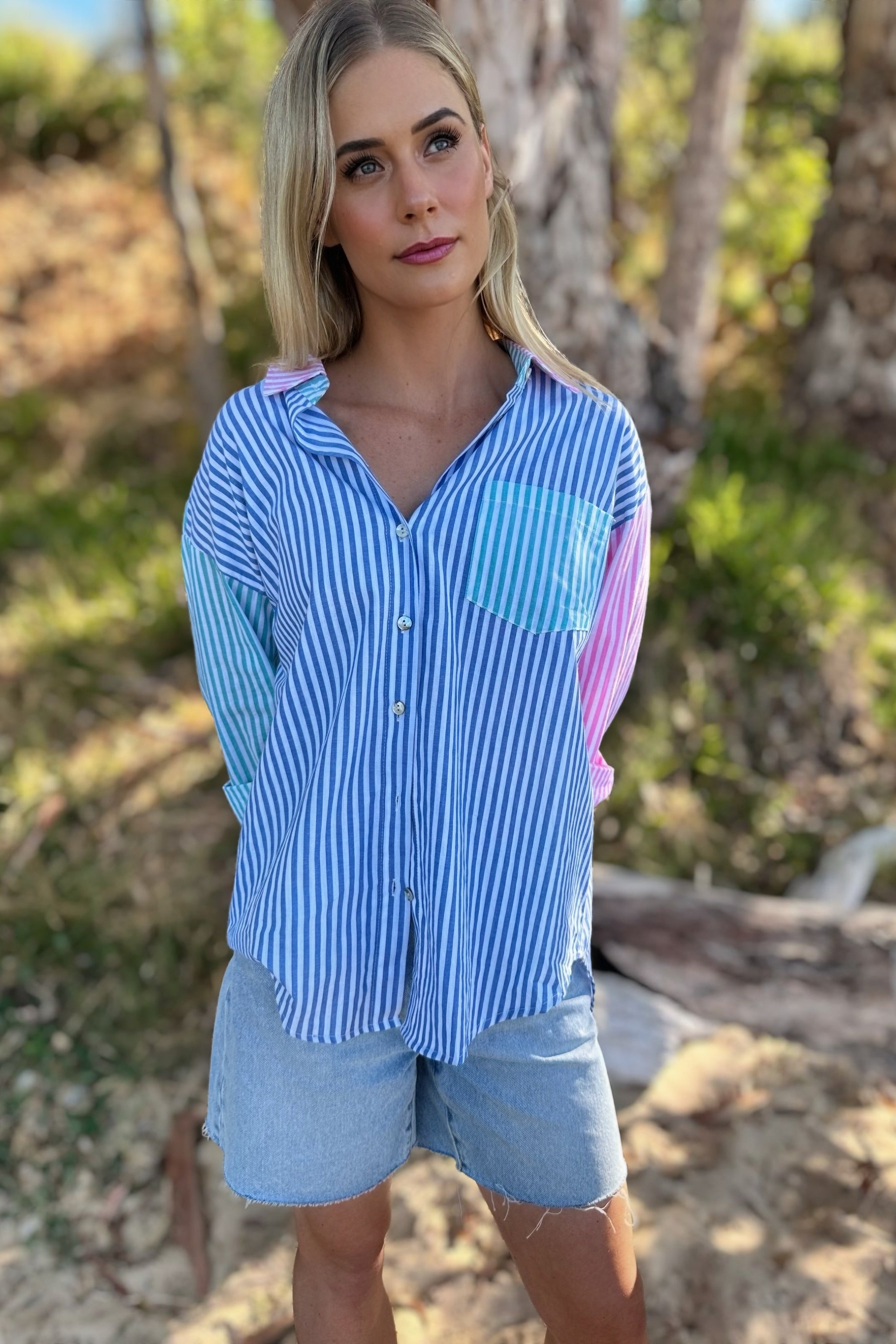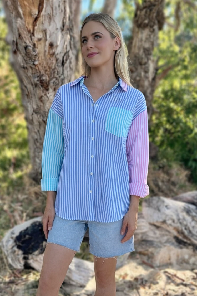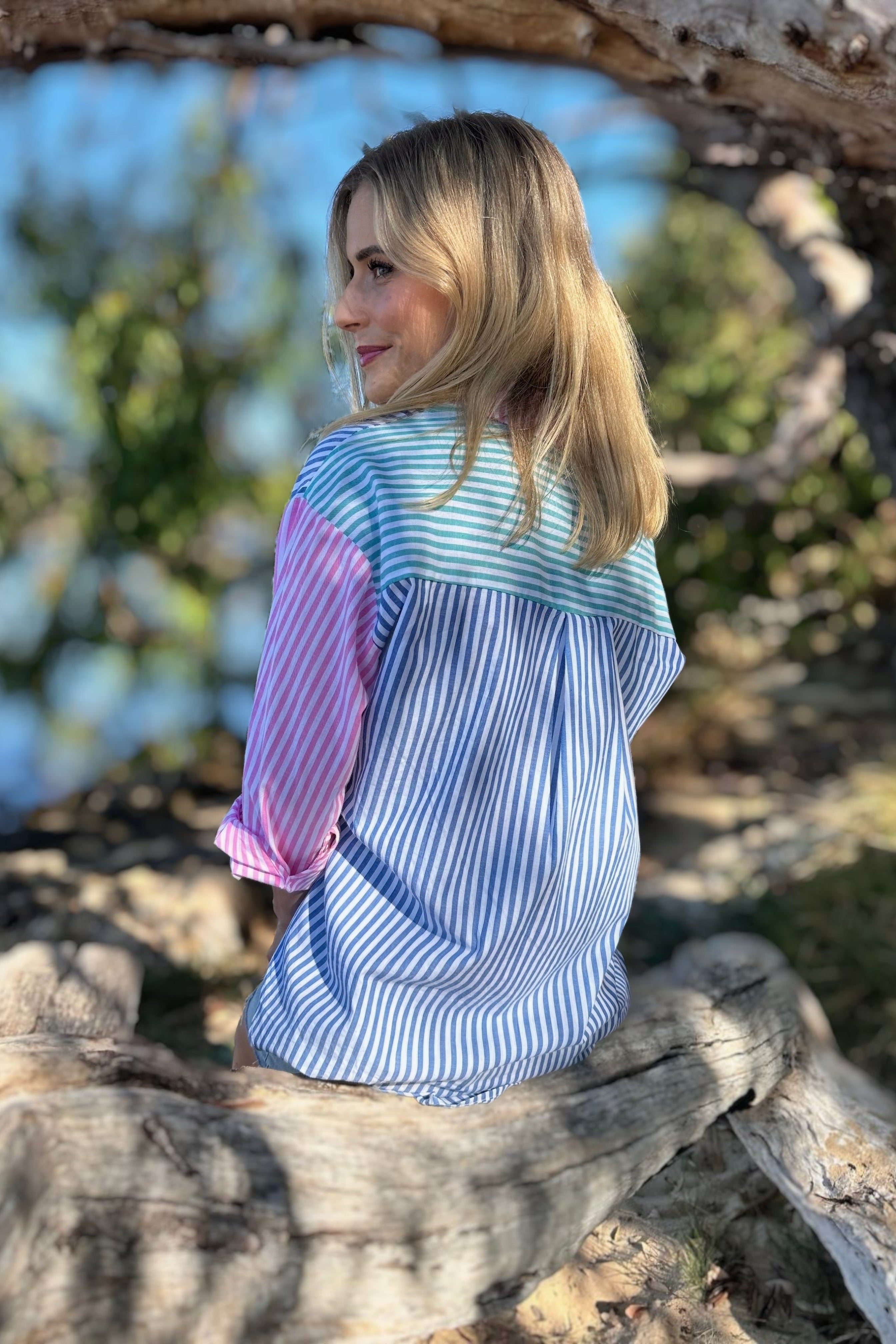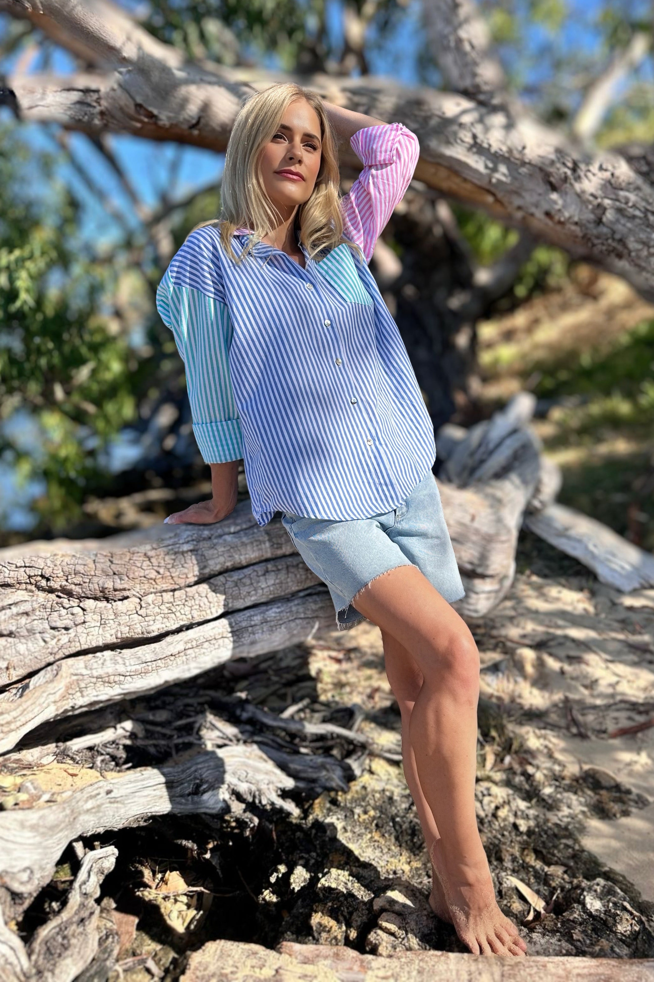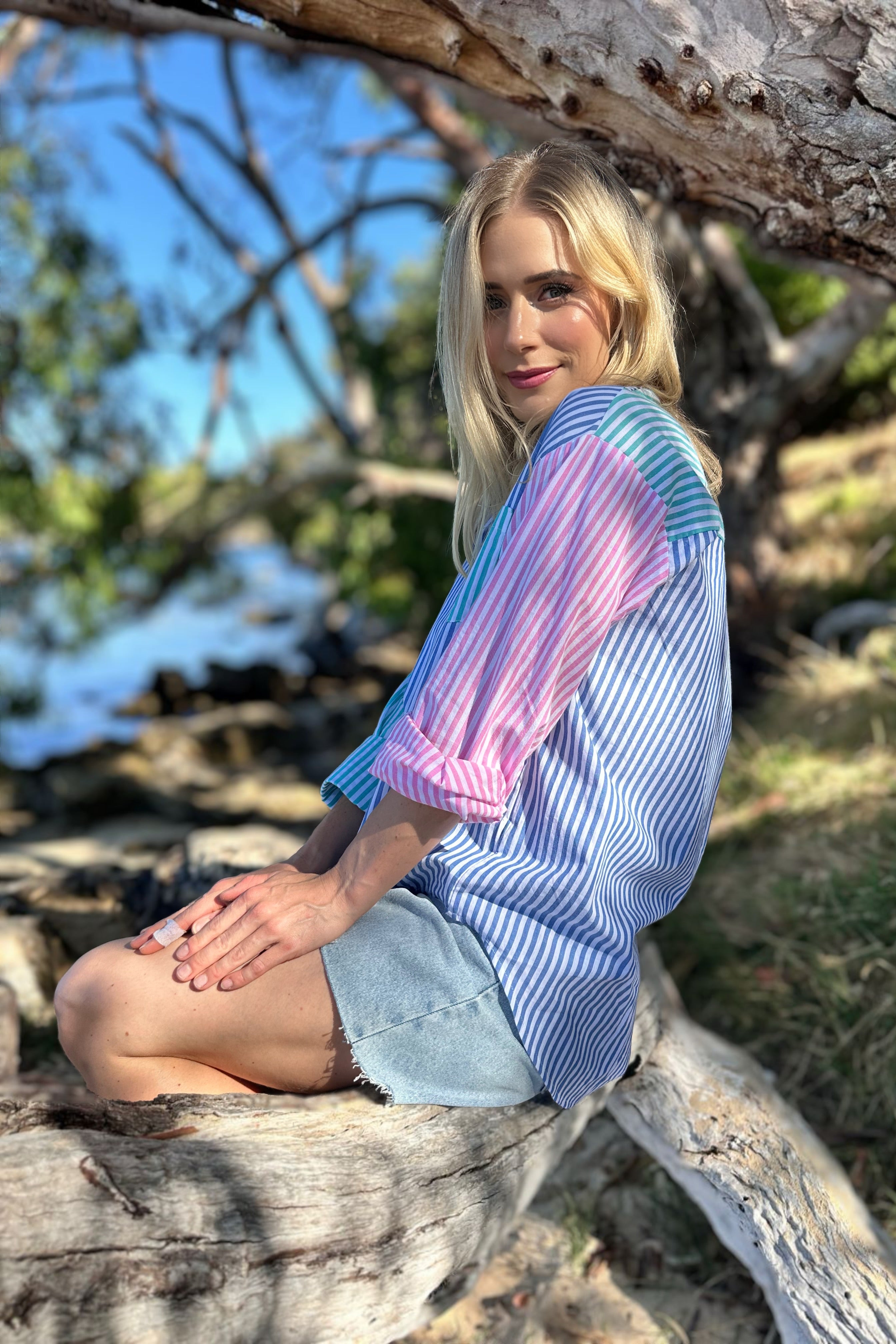 Easy, relaxed and just a little bit playful — the Sunday Boyfriend Shirt is made for slow mornings, long lunches and those effortless “threw it on and went” days. Cut in a classic boyfriend silhouette with a fresh mix of soft stripes, it brings colour without trying too hard. Crafted from breathable 100% cotton, it’s the kind of shirt you’ll reach for on repeat.