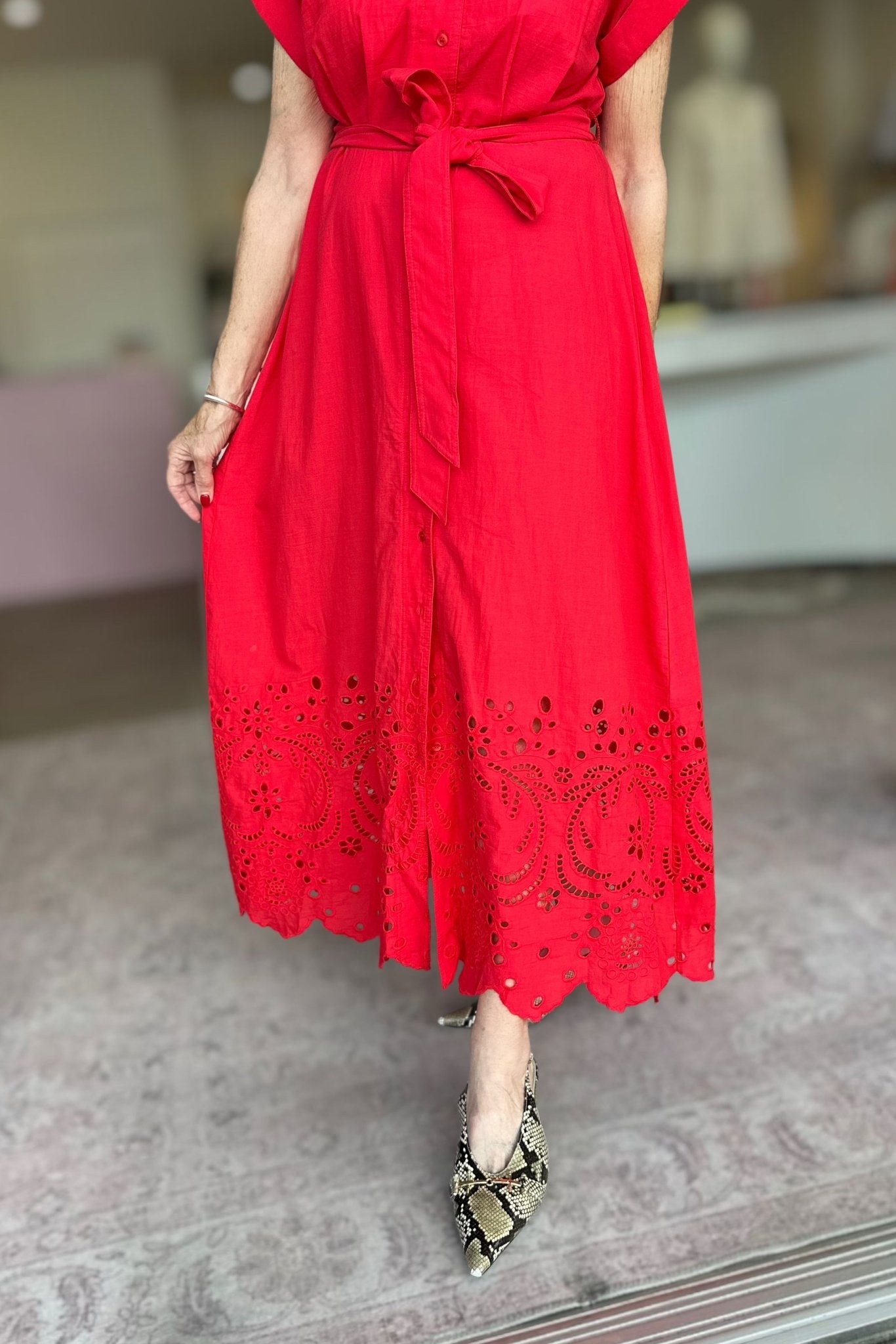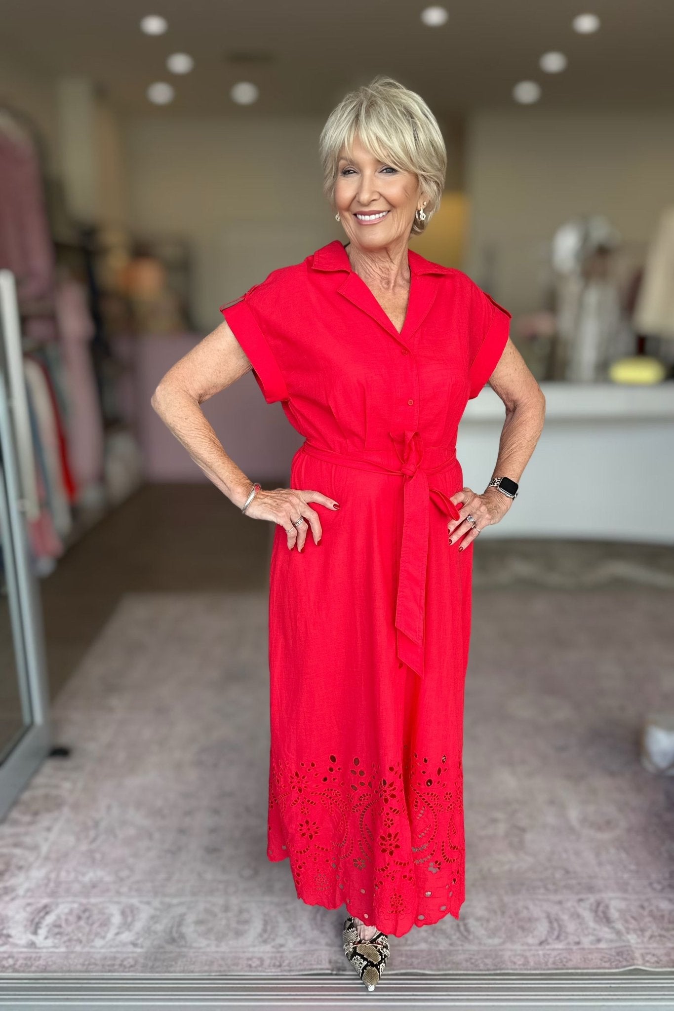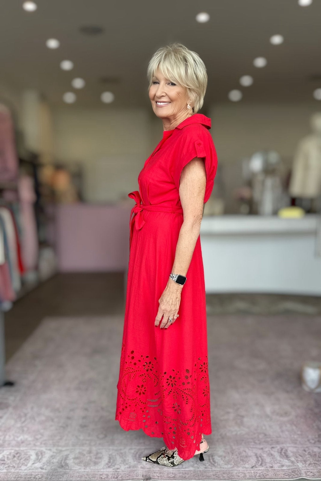 Make an entrance in the Versailles Broderie Maxi Dress — a timeless shirt-style silhouette reimagined in vibrant chilli red. Crafted from breathable cotton, it features intricate eyelet embroidery along the hem for a feminine finish. The self-tie belt cinches the waist for a flattering fit, while the button-through front and soft collar keep it effortlessly refined.